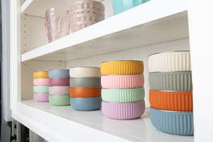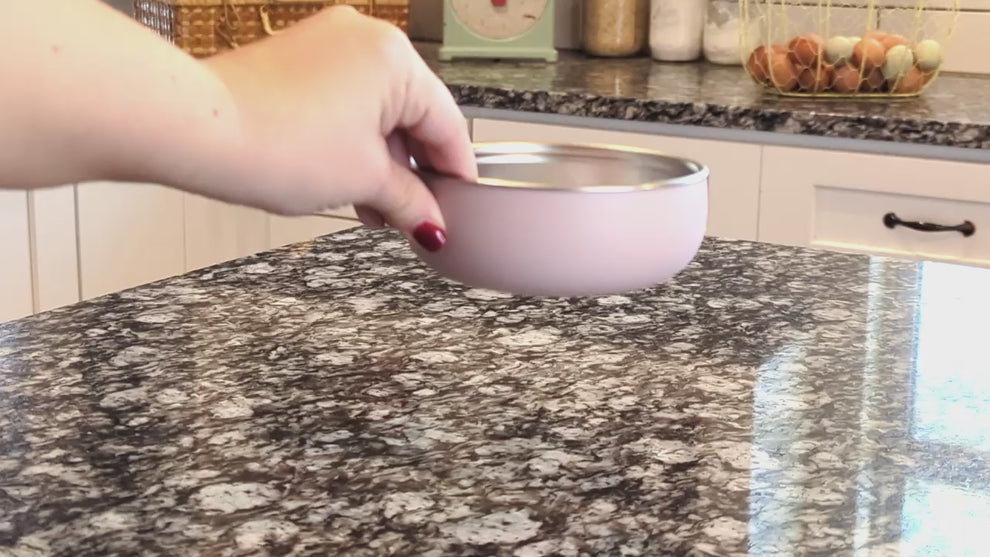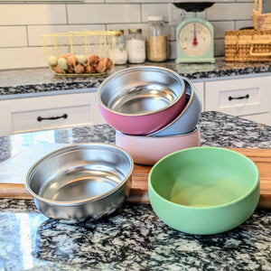 We love these bowls! Fashionable little bowls that are slip resistant and definitely durable. I love that the sleeve can slip off and is super easy to clean!